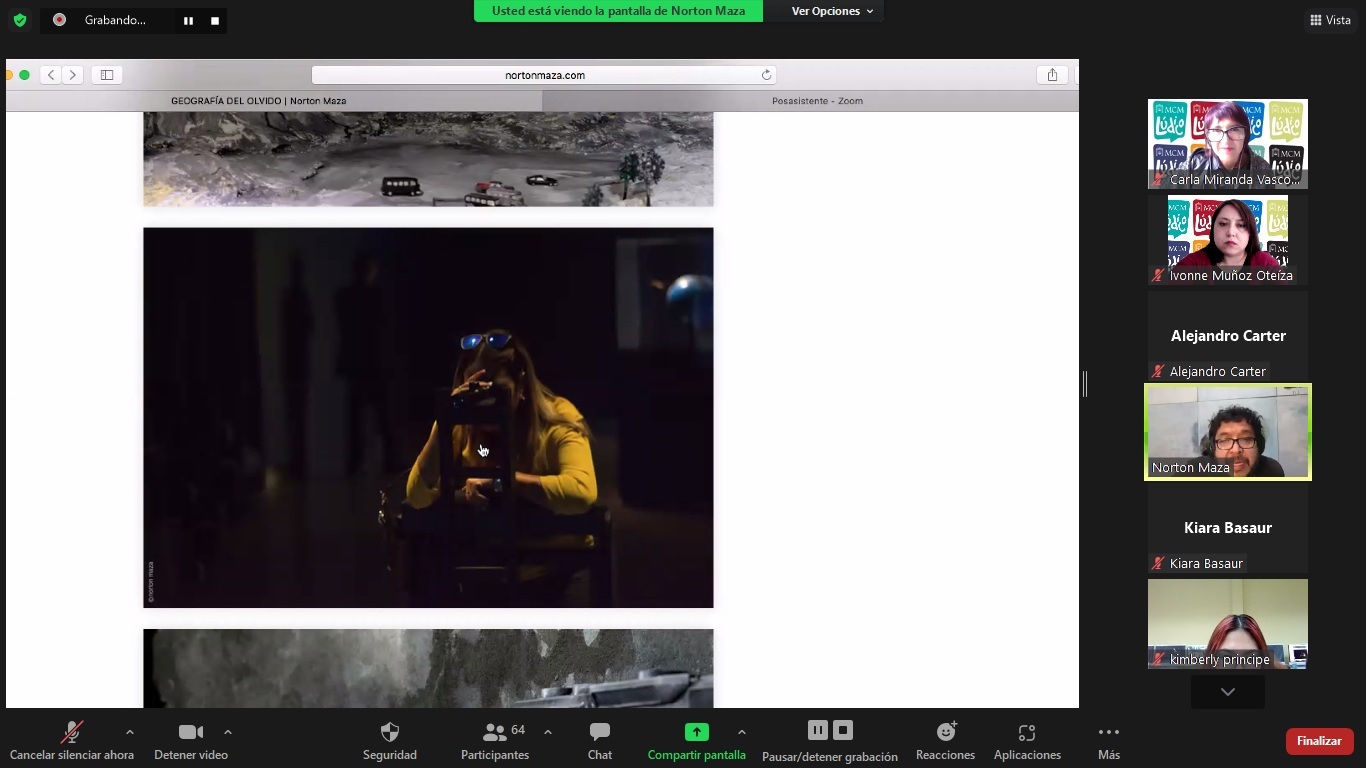 Por su parte, Norton Maza expuso, detalladamente y compartió cómo surgen los temas de sus trabajos, la metodología de traspasar la maqueta o diorama al plano de la fotografía y la emulación con la pintura, compartió con los estudiantes el proceso creativo y constructivo de algunas de sus obras como: Obra final (2010), Estudio para la sinfonía del poder eterno (2008) y Geografías del olvido (2018).