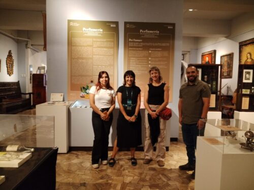 La curadora de la exposición Carla Miranda y la mediadora Paulina Salinas recibieron este martes 17 de marzo, a Rosario Balcells Encargada de Desarrollo Institucional y Francisco Mora Encargado de Colecciones del Museo Regional de Rancagua, con el fin de concretar la itinerancia de la exposición temporal Perfumería Patrimonial Chilena y la memoria olfativa de las colecciones del Museo del Carmen de Maipú, actualmente en exhibición.