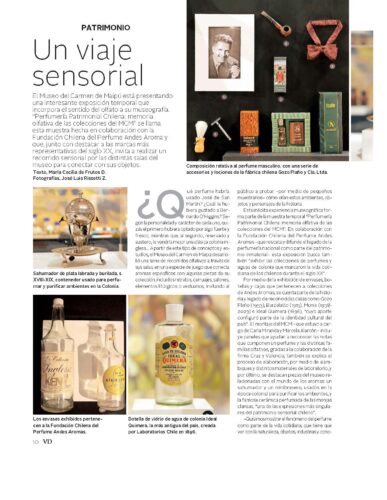 Dentro del marco de la exposición «Perfumería Patrimonial Chilena, memorias olfativas de la colección del MCM», la periodista María Cecilia de Frutos nos comparte la nota de la revista VD de El Mercurio. Un viaje sensorial que representa la identidad chilena y un recorrido guiado a través del olfato.